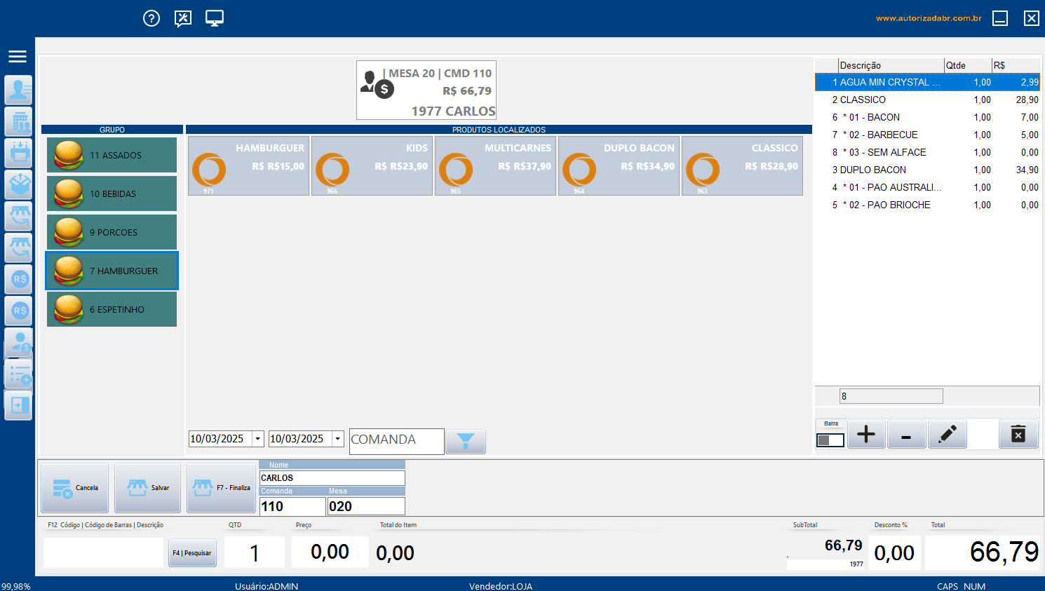 Sistema voltado para bares e restaurantes, em que a comanda é emitida direto para a cozinha, além do fechamento por mesa, oferecendo diversas opções de pagamentos como crédito, débito, dinheiro ou Pix.